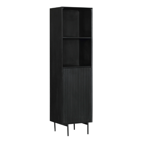 Het verticaal ingelegde lattenpatroon geeft deze boekenkast een moderne en tijdloze look. Het metalen frame is afgewerkt met een zwarte lak, wat een contrast creëert met de zwarte kleur van de kast.