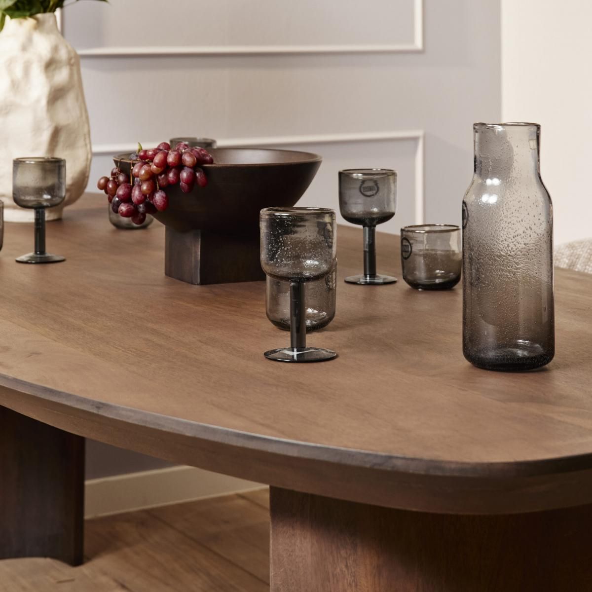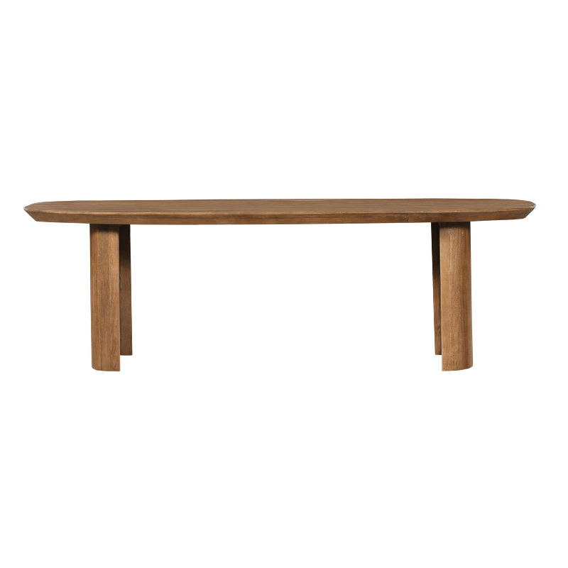 De eettafel Maré is volledig uitgevoerd in massief mango hout in een walnoot-kleur en heeft twee half ronde poten.