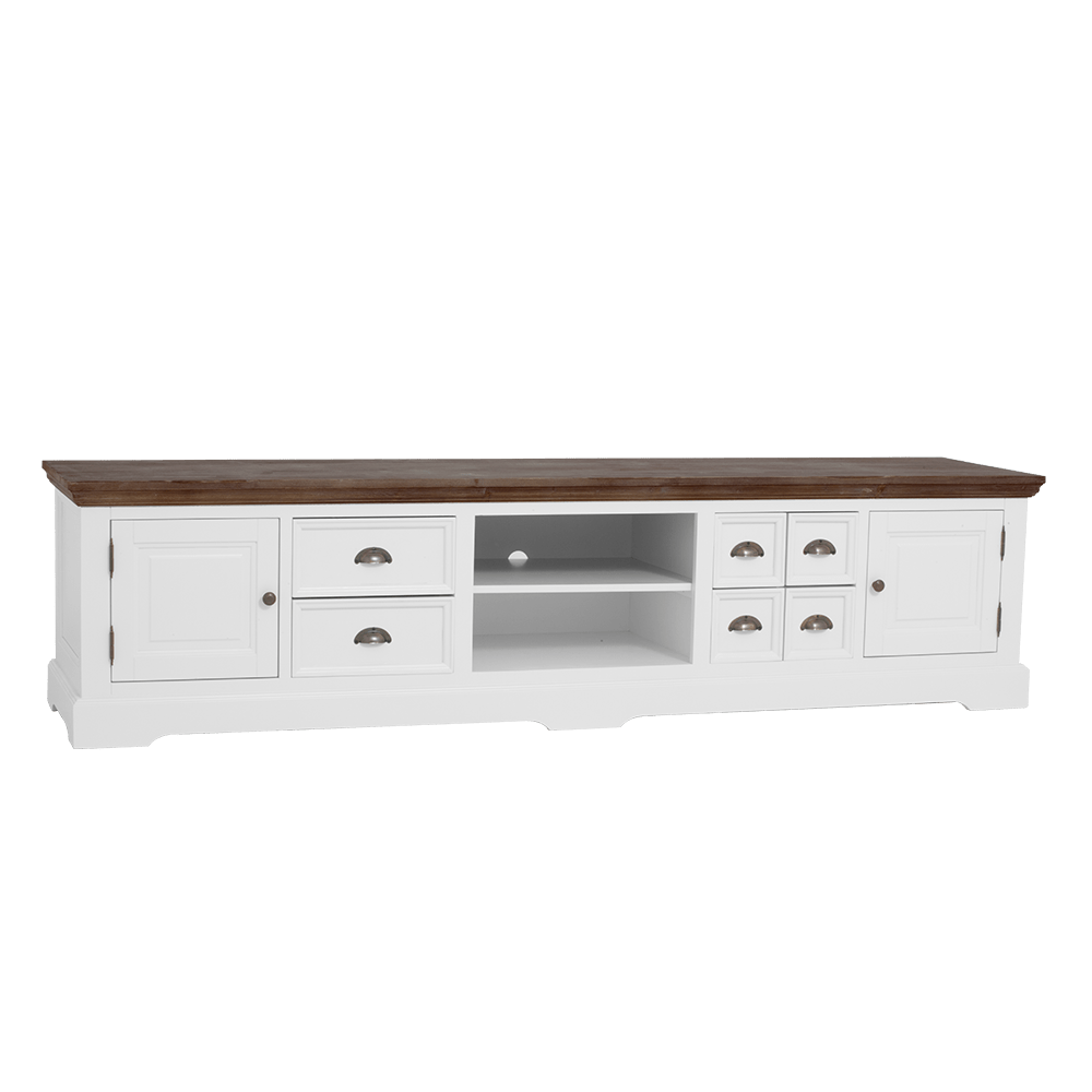 Dit tv-meubel is vervaardigd uit robuust grenenhout en biedt naast een prachtige uitstraling ook een duurzame kwaliteit. Met een breedte van 220 cm, een diepte van 50 cm en een hoogte van 54 cm, biedt het voldoende ruimte voor al uw media-apparatuur en accessoires. Dit specifieke model is uitgevoerd in een frisse witte tint, maar voor wie een andere look prefereert, is de Fleur-serie ook verkrijgbaar in een warme bruine of elegante grijze afwerking, waardoor er altijd een kleur is die perfect aansluit bij uw persoonlijke smaak en bestaande inrichting.