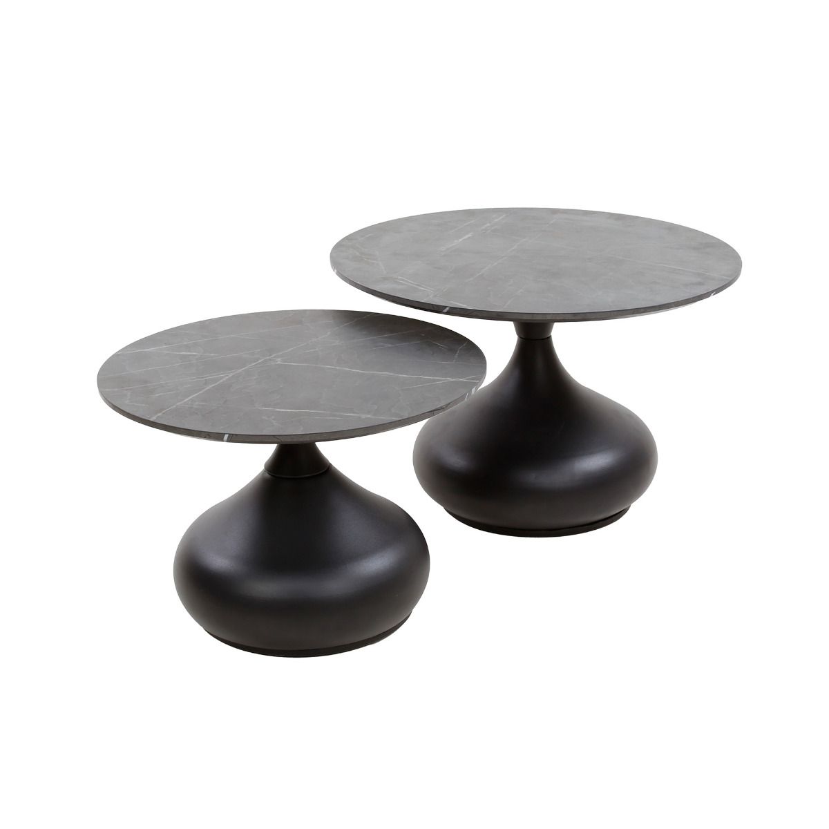 Deze ronde koffietafelset van 2 is afgewerkt met melamine en heeft een keramische uitstraling. De metalen drop-leg constructie zorgt voor extra stabiliteit en steun. Het handgemaakte tafelblad heeft een laag melaminehars die op hout is aangebracht door middel van hitte en druk.