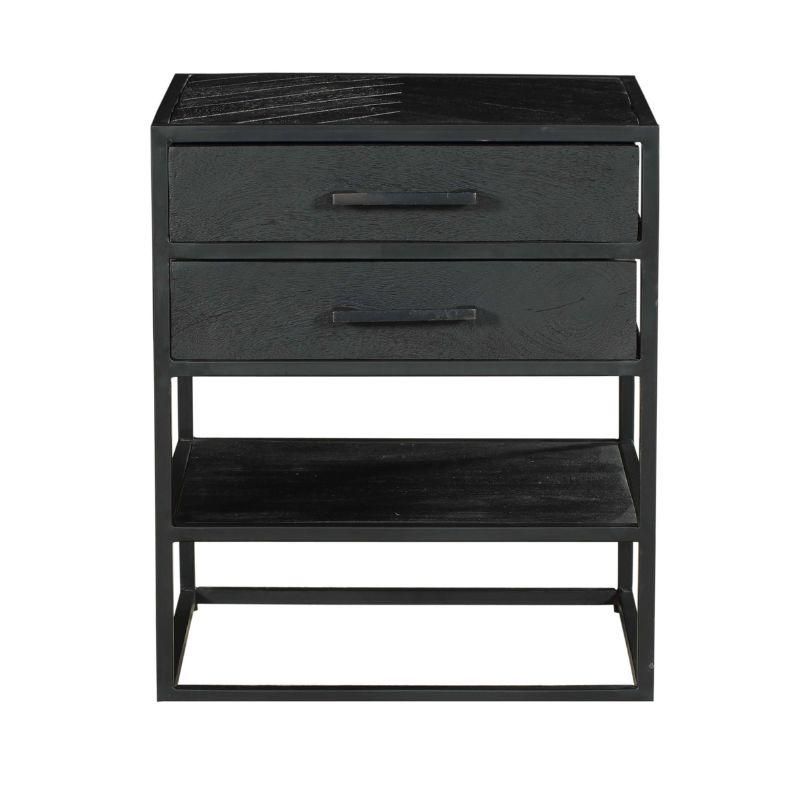 Het nachtkastje is vervaardigd van gezandstraald mangohout, wat een natuurlijke en tijdloze uitstraling geeft. Het metalen frame en de metalen handgrepen zijn afgewerkt met een zwarte lak, wat een modern en stijlvol contrast creëert met het hout.