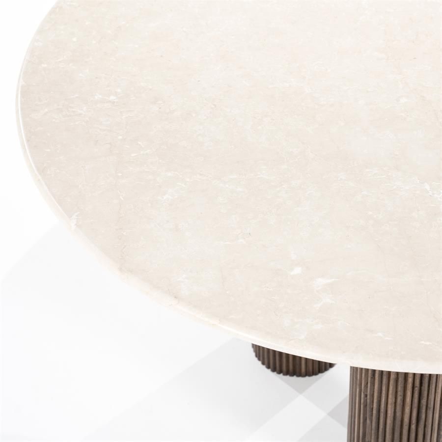 Het marmeren blad in een lichte beige tint ademt elegantie en brengt een vleugje luxe in elke maaltijd. Ondersteund door drie geribbelde poten van mango hout, belichaamt de Xavi een perfecte balans tussen natuurlijke warmte en moderne grandeur.